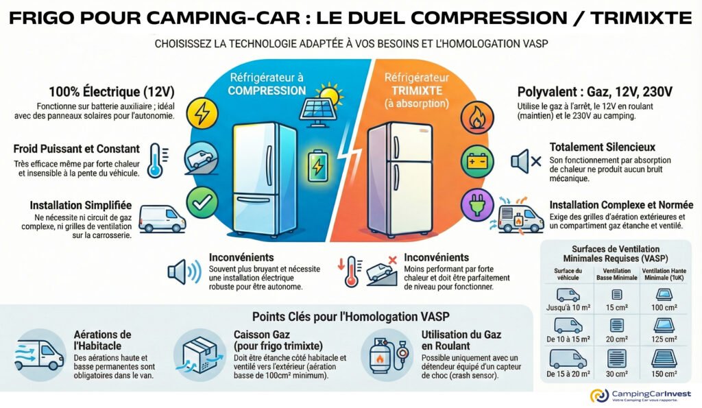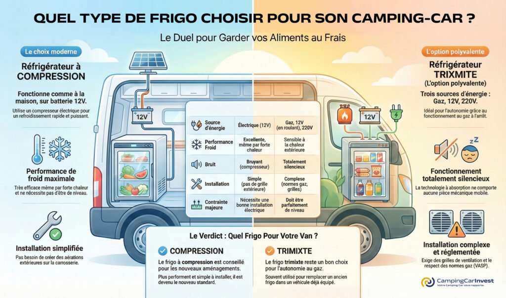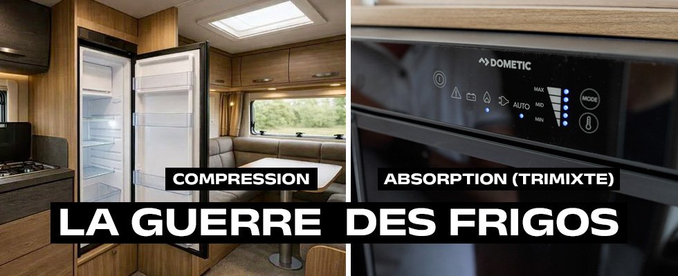 Dans les camping-cars, vans, fourgons aménagés, profilés ou capucines, deux grandes technologies de réfrigérateurs coexistent : le frigo à compression et le frigo à absorption, aussi appelé tri-mixte.
